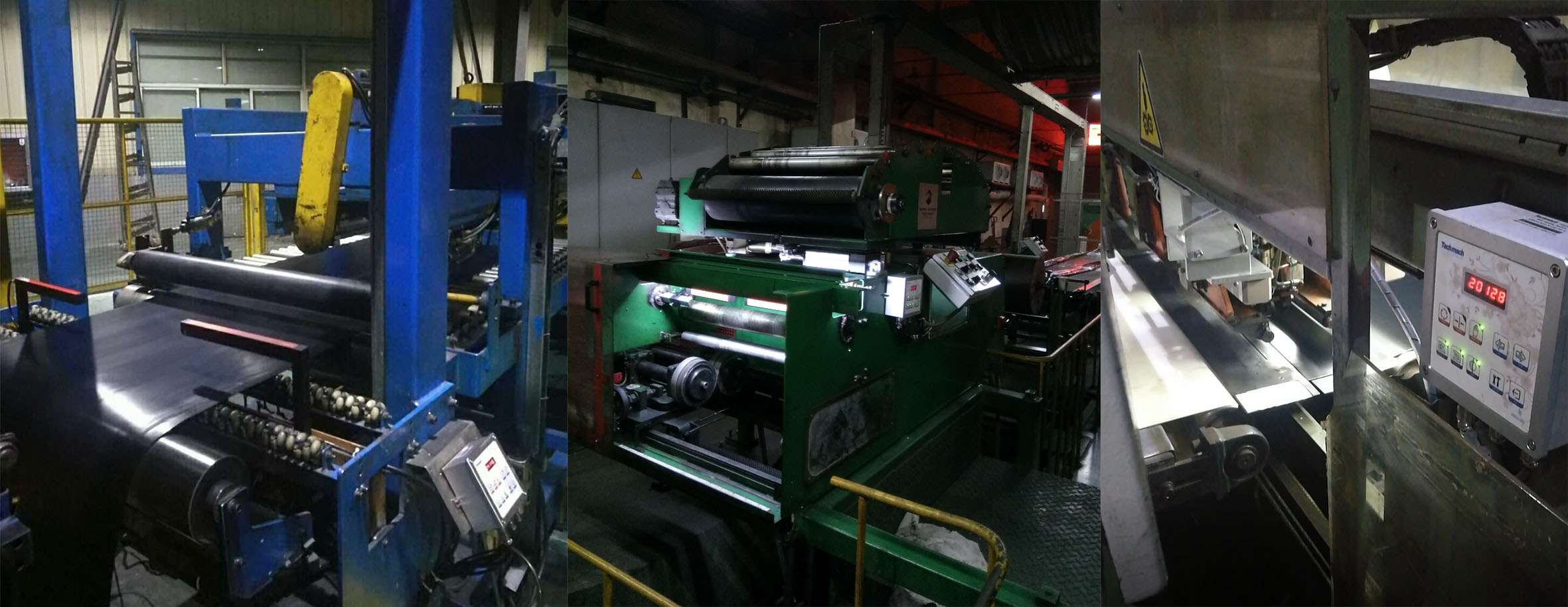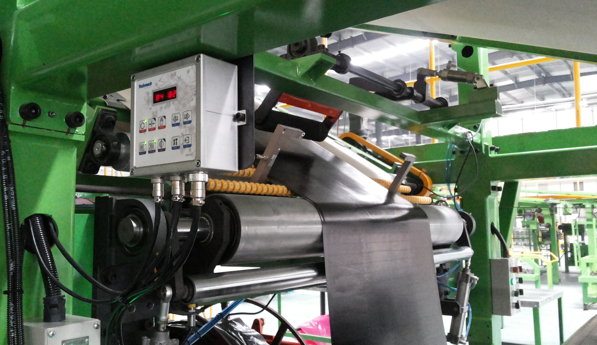 在胎面、胎側擠出生產線上,Techmach糾偏主要用在墊布的導開,CCD定中,CCD測寬,工作穩定,精度高,畫面實時顯示。